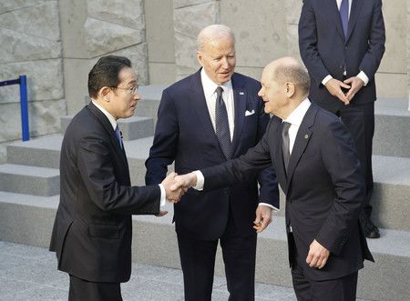 Kishida Fumio (gauche) serrant la main du chancelier allemand Olaf Scholz, en compagnie du président américain Joe Biden lors du sommet du G7 tenu à Bruxelles (24 mars).