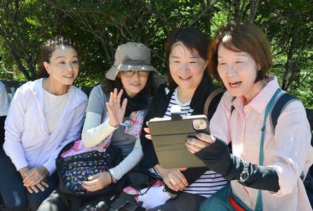 Parmi les victimes de l’accident se trouvaient trois enseignantes du lycée pour filles Shinwa, à Kobe, qui revenaient d’un voyage dans la capitale où elles avaient cherché des endroits à faire visiter pour une excursion en classe. Lundi, quatre anciennes élèves de cet établissement sont venues prier sur la stèle commémorative. Elles ont lancé une discussion en vidéo avec d’autres personnes en lien avec l’école qui n’ont pas pu se rendre à la montagne, afin de partager leurs expériences (photo ci-dessous).