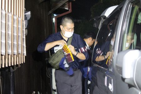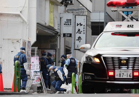 Les enquêteurs devant l’établissement où a eu lieu le drame. Il se trouve à environ 300 mètres de la gare de Shinbashi.