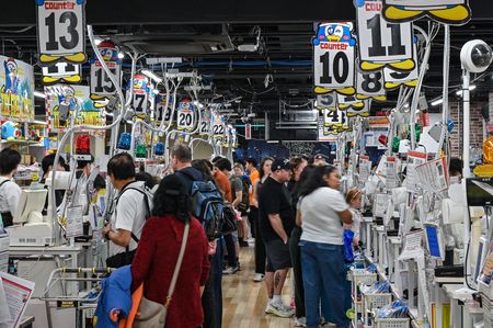Des touristes étrangers à la caisse du magasin Don Quijote de Shibuya, à Tokyo.