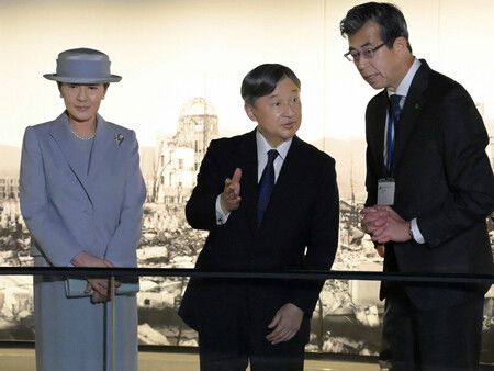 Ils ont ensuite effectué leur première visite au Musée des vestiges de la bombe (Hibaku ikô tenji-kan), ouvert depuis 2022 dans le Parc de la Paix de Hiroshima. Naruhito a exprimé sa tristesse en y voyant les restes des habitations meurtries et en écoutant les explications sur le nombre conséquent de morts.