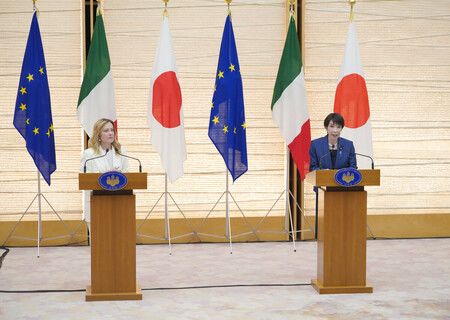 Meloni a pour sa part déclaré : « Nous aspirons à une paix fondée sur un ordre libre et juste. » Elles ont par ailleurs annoncé avoir conclu un « accord spatial » destiné à promouvoir l’utilisation pacifique de l’espace, ainsi que l’élargissement des échanges culturels et humains à l’occasion du 160ᵉ anniversaire de l’établissement des relations diplomatiques entre les deux pays.