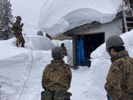 Des forces d’autodéfense ont été appelées pour déblayer la neige d’une maison qui risquait de s’effondrer, et dont le résident est une personne âgée. Le 9 février à Uonuma, dans la préfecture de Niigata.
