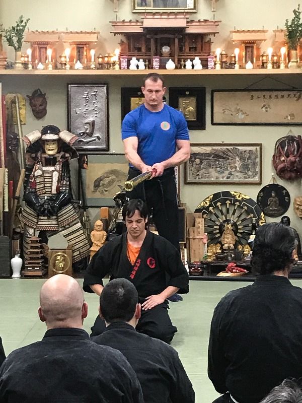 Le grade le plus élevé au Bujinkan est celui de 15e dan. Ce jour-là était organisé un examen de promotion au grade de 5e dan. Le candidat est assis sur les genoux. Un examinateur, muni d’un sabre de bambou rembourré et gainé de cuir se tient dans le dos du candidat et lui assène un coup sans le prévenir. L’épreuve consiste à sentir quand le coup va arriver par la seule concentration sensorielle, et à l’esquiver. Si le candidat esquive le coup, il est 5e dan ! Ce grade autorise l’ouverture d’un dôjô, aussi est-il bien compréhensible que les lauréats ne puissent retenir un sourire.