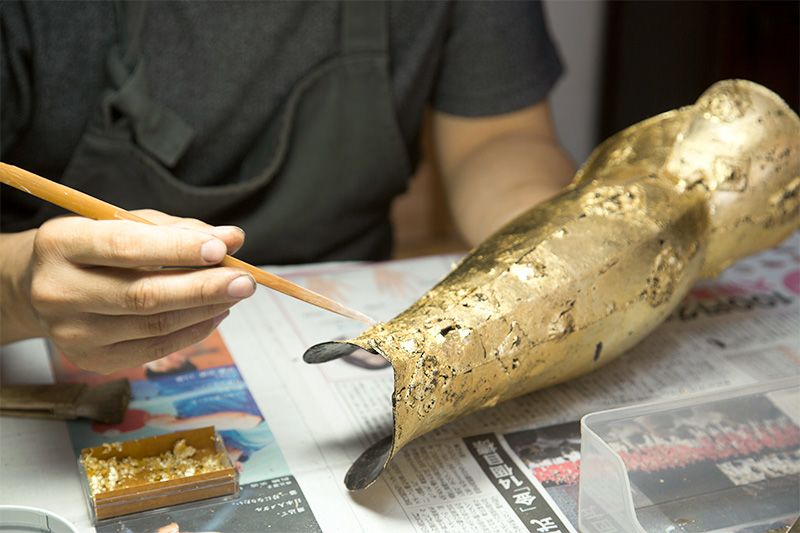 Application de feuille d’or sur un élément d’armure, à l’aide d’une pince en bambou. Une grande partie des armures de la seconde moitié du XVIe siècle étaient entièrement dorées à la feuille.