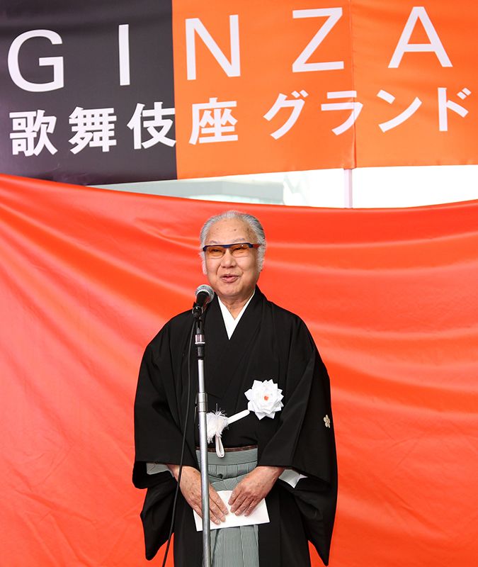 « Vétéran » du kabuki et Trésor National vivant, Sakata Tôjûrô prononce un discours lors d’une cérémonie avant la parade. « Il pleut aujourd’hui et nous pouvons donc espérer que les spectateurs vont venir inonder le Kabukiza » a-t-il déclaré avec humour. « C’est un nouveau départ sous le signe de la chance. » (Photo : Kamoshida Kôichi)