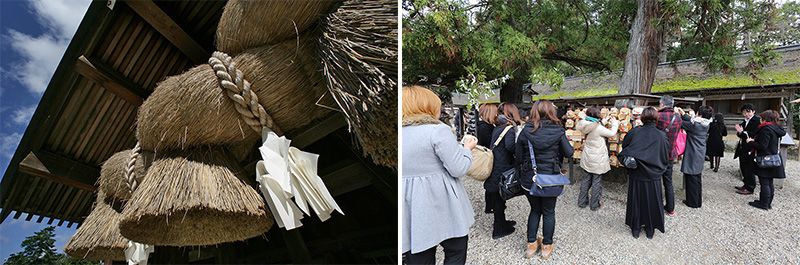 (A gauche) Dans les sanctuaires shintô, les cordes sacrées (shimenawa) marquent la limite entre le monde ordinaire et celui des kami. La shimenawa que l’on voit ici est celle du pavillon des célébrations (haiden). (A droite) Le sanctuaire d’Izumo est aussi réputé pour favoriser les unions. De nombreux visiteurs viennent faire un vœu pour réussir un mariage heureux.