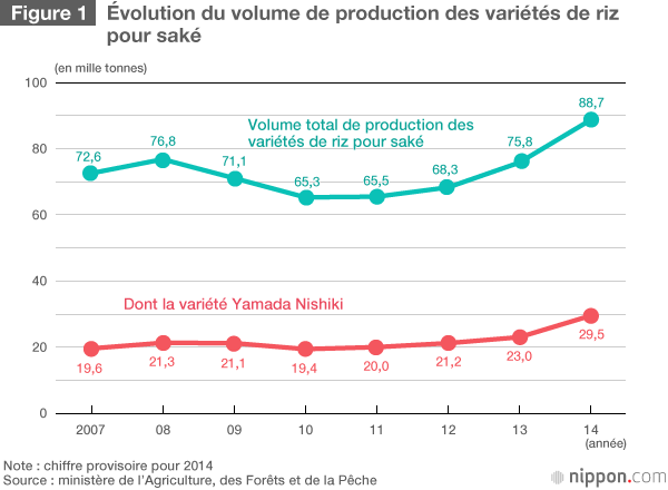 D’après les résultats de l’enquête du ministère de l’Agriculture, des Forêts et de la Pêche sur la production agricole, les quantités inspectées de Yamada Nishiki ont été de 29 577 tonnes pour l’année 2014, soit une augmentation de 28 % par rapport à l’année précédente et de 39 % (21 217 tonnes) par rapport à 2012. Le volume de production ne cesse de progresser.
