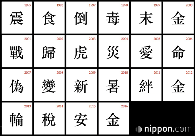 日本漢字能力檢定協會從1995年開始每年舉行「年度漢字」的評選活動,向社會公開徵集候選漢字。今年,「金」字贏得了153,562張選票中的6,655票,位列榜首。據說投票民眾列舉的推薦理由,除了里約奧運日本運動員掀起奪金狂潮外,前東京都知事舛添要一涉嫌挪用政治資金等政治和金錢相關問題、贏得美國總統選舉的川普的金髮、憑藉一首「PPAP」席捲全球的Pico太郎的金色服裝等,都與「金」有關。這是「金」字第3次獲選年度漢字,之前2次(2000年和2012年)獲選也都是在奧運年。