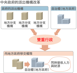 民主黨執政後也依舊步伐遲緩,但以近畿(日本本州中西部地區,包括京都、大阪2府和奈良等5縣——譯註)為中心的“關西廣域聯合(數個普通地方公共團體、特別區,為加強地方自治而組成的共同進行某些行政事務的組織——譯註)”以及“九州地方知事會”一直謀求國土交通省、經濟產業省、環境省這三個機構能率先實施在本地區內的移交。對這兩個地區內3省分支機構的移交,政府目前終於打算付諸行動了。總的來說,“對地方分權改革不夠熱心”而遭到詬病的野田佳彥首相,也終於表示將在本次國會上提出法案,以內閣府為中心,推進政府內部的協調工作。