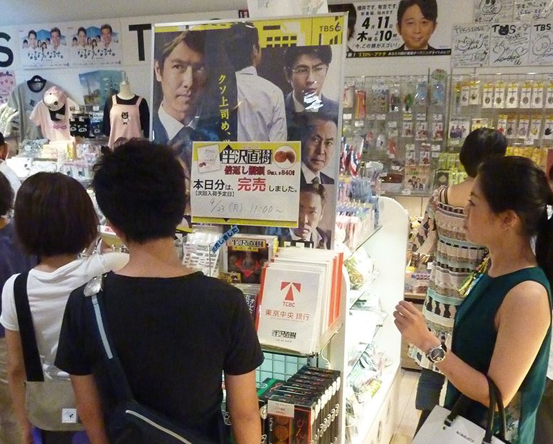 東京赤坂的TBS專賣店裏,熱銷中的各類《半澤直樹》相關商品(照片提供:日刊體育/Aflo)