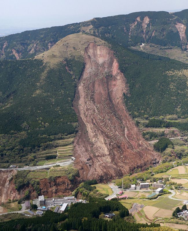 地震引發了山崩,2016年4月16日下午於熊本縣南阿蘇村(圖片提供:時事社)