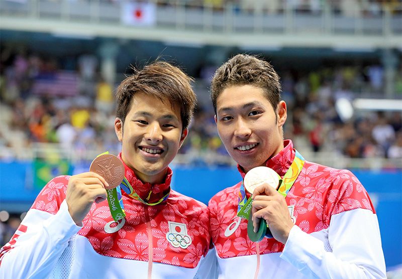 在游泳男子400m個人混合式中,萩野公介(右)和瀨戶大也分獲金牌和銅牌。幾名日本選手登上同一個游泳項目領獎臺,還是60年來的第1次(8月8日)