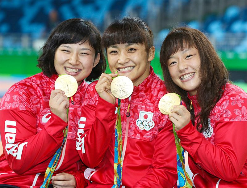土性沙羅、伊調馨、登坂繪莉(從左至右)在自由式角力女子3個級別比賽中分別摘得金牌,笑容滿面。伊調馨成為世界首位奧運自由式角力女子個人項目4連冠得主(8月17日)