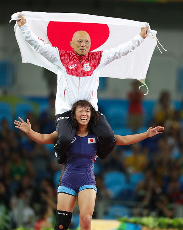 川井梨紗子在自由式角力女子63kg級決賽中擊敗白俄羅斯選手Maryia Mamashuk而奪冠,她把領隊榮和人(上)抬到肩上慶祝勝利(8月18日)