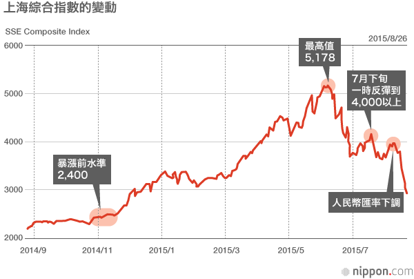 到了8月下旬,上海綜合指數連續4個營業日下跌,乾脆利落地被擊穿了3,500這一市場人士認定的中國政府防守底線。8月25日則時隔8個月後跌破3,000大關。年初以來上漲部分幾乎又跌光了。隨之在東京市場,日經指數連續下跌6個營業日,是安倍內閣上臺以來持續下跌時間最長的一次,時隔半年再次回到18,000日圓以下,甚至出現了「依賴股市上漲和日圓貶值為推動力的『安倍經濟學』,其局限性已經顯現了」(《朝日新聞》社論)的聲音。接著,紐約道瓊斯指數也下跌了1.3%至15,666美元,創造了一年半以來的收盤新低。「全球股市同步下跌」成為現實。