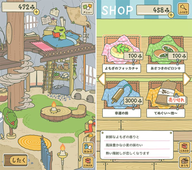 (左)小青蛙在家悠然自得 菜單 旅行準備 商店 院子 (右)玩家可以品評各種旅行用品 抽獎 義式麵包「福卡恰」東歐餡餅「皮羅什基」幸運鈴 手巾(土屬性)售罄 清香和濃郁的麥香風味 熾熱的陽光令人依戀 院子 家