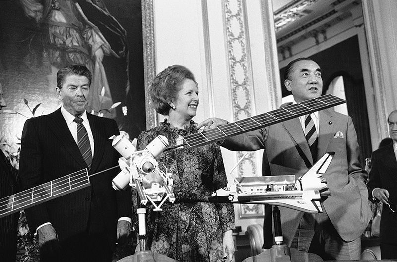 倫敦峰會期間,在太空站模型前談笑風生的柴契爾夫人和中曾根首相。左側為雷根總統(1984年6月9日,照片:Bob Daugherty/AP/Aflo)