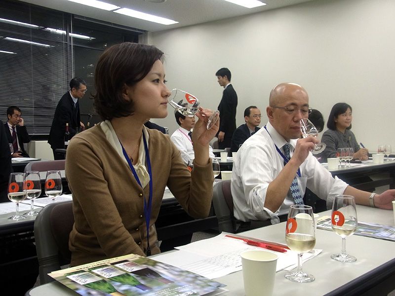 第二天是日本葡萄酒講座。一邊聽著講師的解說,參加者們一邊品嚐著5種日本葡萄酒。「日本特有品種甲州產的白葡萄酒,鐵質含量少,配魚飲用,不會產生生腥味的原因就在這裏」,「日本的葡萄酒,以酸味柔和為特色。」
