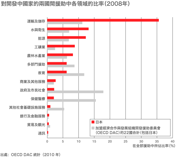 | 教育 | 建設學校、培養教師,提供基礎教育的機會,提高教育品質;發展高等教育、充實職業訓練,培育支撐開發中國家的國家建設和經濟發展的人才等 |