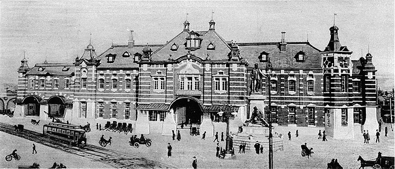 1912年開野當初的車站(《日本相冊》,國立國會圖書館收藏)。這座與東京站丸之內車站大樓相仿的火車站,在1923年的關東大地震中毀於大火,此後於1925年重建,並於1936年再建,同時設置了鐵道博物館(交通博物館的前身)