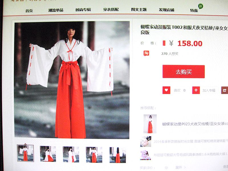 動漫主人公們的Cosplay服裝就是其中之一。在中國,「Cosplay」熱漸漸升溫。能證明這一點的,就是中國的「Cosplay」網站。該網站銷售各種各樣的動漫服裝,比如《名偵探柯南》的那個鮮藍色夾克、淡藍色褲子,再配上紅色蝴蝶結,共計75元;《犬夜叉》裏桔梗巫女的服裝是158元;《航海王》的主角魯夫的服裝,上紅下藍,一套96元。
