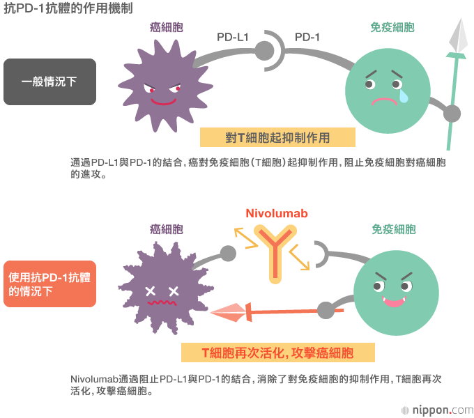 2014年,由小野藥品工業公司(總部:大阪市中央區)研製的新概念抗癌藥物Nivolumab(納武單抗,商品名稱:Opdivo點滴靜脈注射液®)在日本問世,作為有劃時代意義的「癌症免疫療法」備受期待。主導該新藥開發的是京都大學的本庶佑先生(現為京都大學客座教授、靜岡縣公立大學法人理事長),他長期引領著世界免疫學的研究。