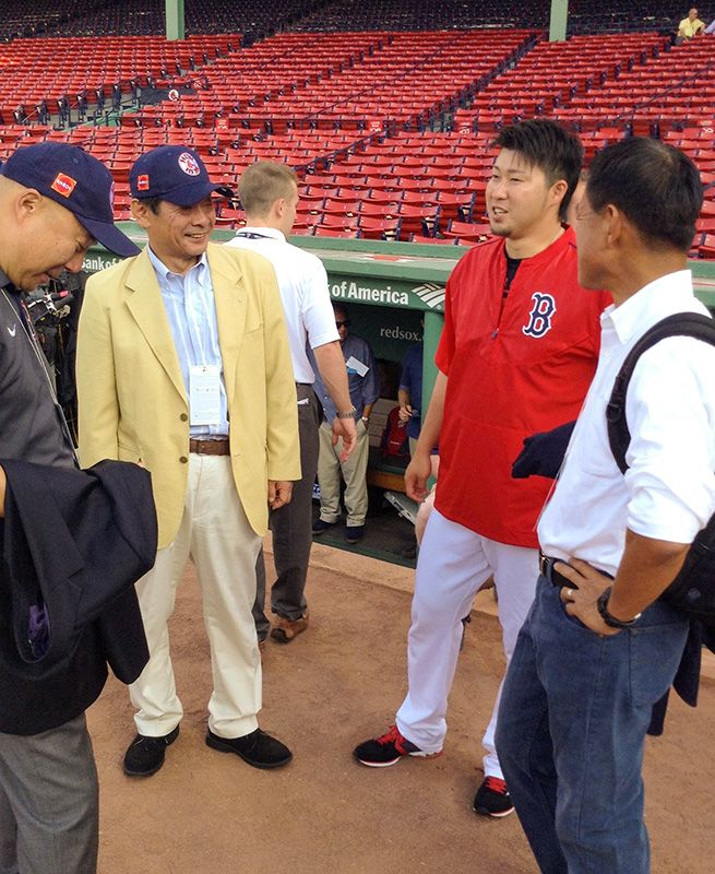 在芬威球場,ENEOS社長杉森務和波士頓紅襪隊投手田澤純一談笑風生