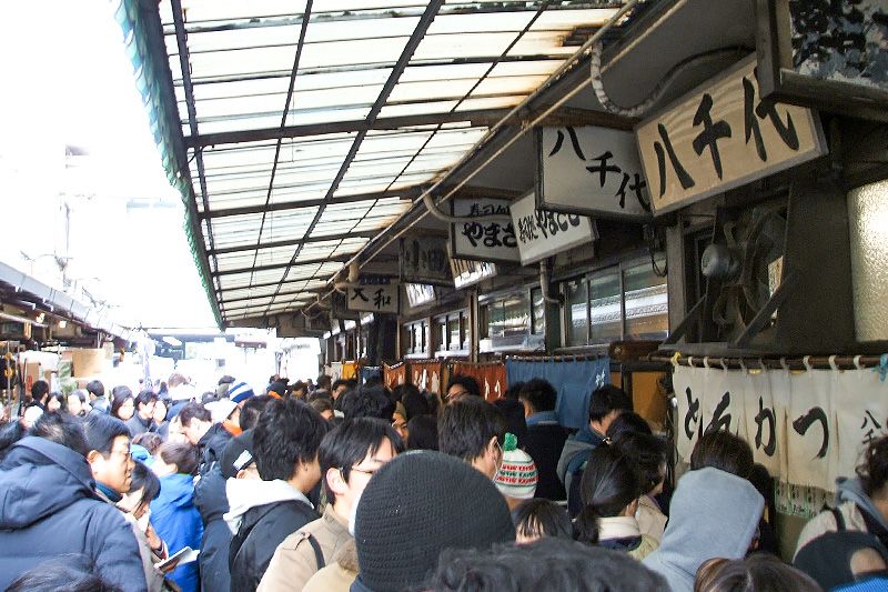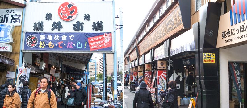 在築地市場的東側擴展出去的「場外市場」,是一個大型商店街,鱗次櫛比地開著食材食具專賣店、餐廳等大約500家店鋪。有人評論說,「『場外市場』和築地市場融為一體,創造了築地的繁華」。