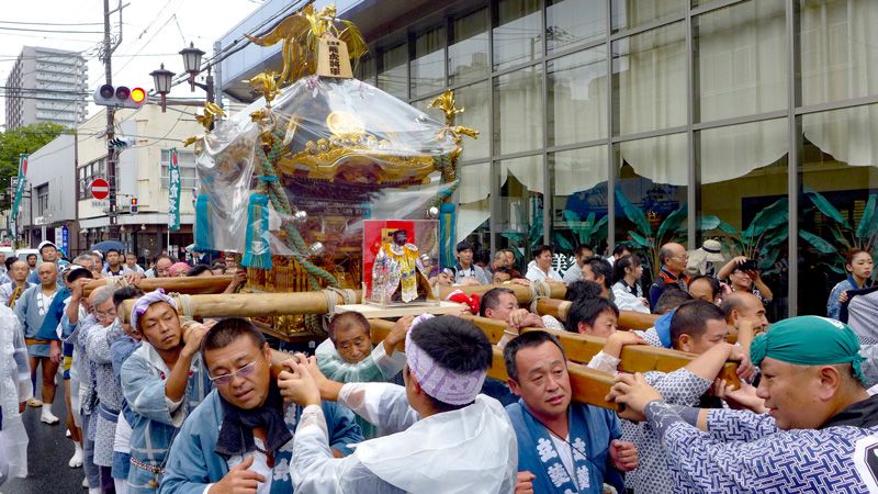 在水戸市内乘上神轎遊行的飛虎將軍。杉浦茂峰氏為臺灣人所崇敬,尊為神明,當地稱「飛虎將軍」(撮影、提供:片倉佳史)