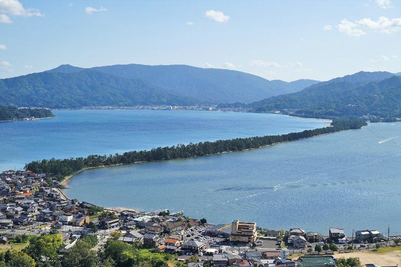 籠神社前方的天橋立也是與日本神話息息相關的地方,丹後風土記中記載,天橋立原本是伊邪那岐大神為了通行於天上地下所造的梯子,在梯子倒下後變成現在的樣子。天橋立是長約3.6公里的砂洲,上面大概有8000棵自然生長的松樹,自古即與廣島的宮島,宮城的松島合稱日本三景,是京都府北部最重要的景觀地。