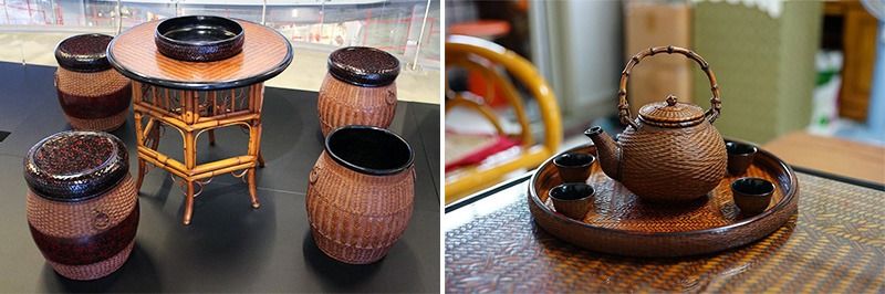 李榮烈的代表作,是以籃胎漆器的技法所製作的桌椅和茶具組。光是一個茶壺,少說也要花費一年的時間製作,在燻製後的竹編胎體上多層敷塗生漆所製作出的茶具和竹籠,帶有深層的色彩韻味,溫潤與堅韌並存。
