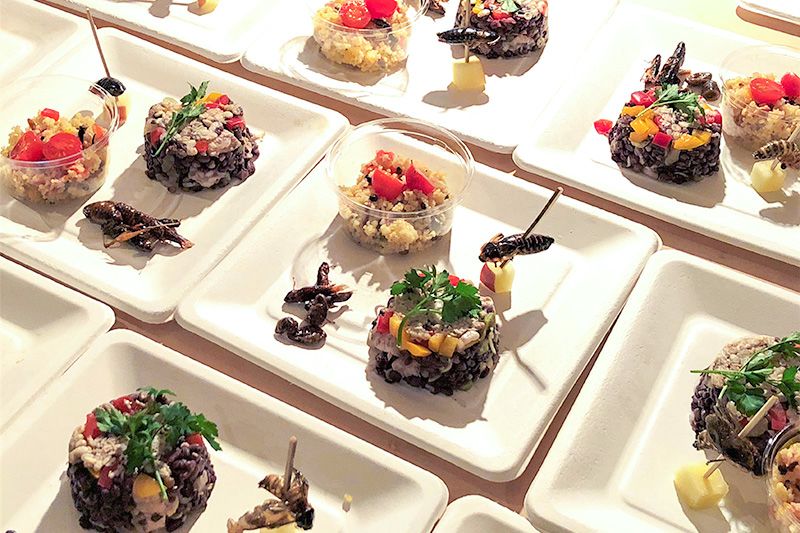 蜂蛹拌阿拉伯小米和炸蟑螂串
