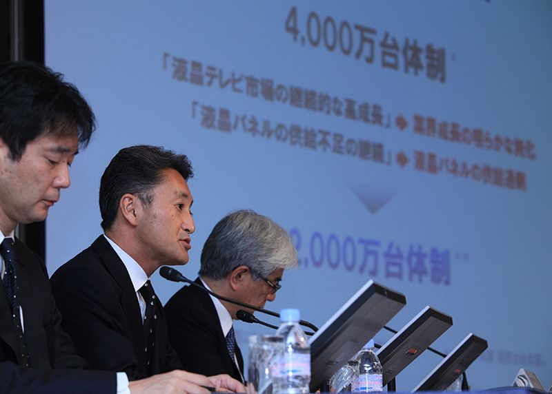 索尼副社長平井一夫等公佈了2011年度上半年決算,同時表明將年度4,000萬台的平板電視銷售目標縮減為2,000萬台(2011年11月2日)(圖片:時事通信社)