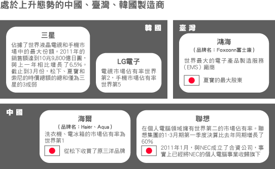 日本的家電製造商正在困境中掙扎。索尼、夏寶、松下這三家公司在2012年3月的結算中,出現了總計1兆6,000億日圓的龐大赤字,經營重整迫在眉睫。出現赤字的原因是電視事業的虧損。2011年,實現了從類比訊號轉播向數位訊號轉播的過渡,政府的家電“生態積分”制度(為鼓勵居民使用節能環保型家電的制度,消費者可用購買相關產品所獲得的積分兌換其它產品或者相關服務——譯註)也劃上了句號。也就是說,在國家電波政策和稅金的庇護下一直在預支消費需求的日本家電產業終於喪盡了底氣。
