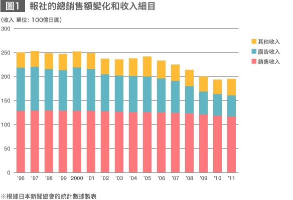 首先請看圖一所示的銷售額的變化。從實際數據中可以得知,雖然較之國外規模不同,但報業本身也是呈現萎縮趨勢。銷售額在、1997年達到2.5兆日圓的峰值後,2011年維持在將近其八成的水準。
