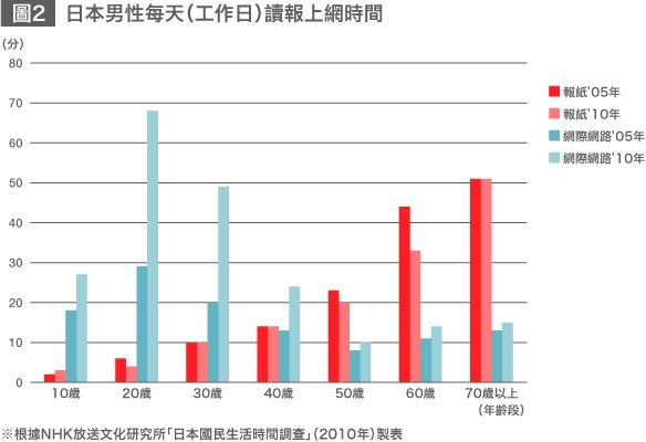 這是2005年和2010年NHK放送文化研究所對男性每天平均讀報和上網的時間所作的調查。從這裏可以看到,2010年20歲年齡段的男性,讀報時間平均每天僅有4分鐘,而上網時間則長達68分鐘。而且,2010年30多歲的男性,與他們2005年20多歲時相比,讀報時間並沒有出現太大的增加。