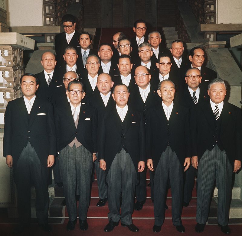 第二次田中內閣組閣時的紀念合影。前排中央者是田中角榮。攝於1972年12月(時事通信社)