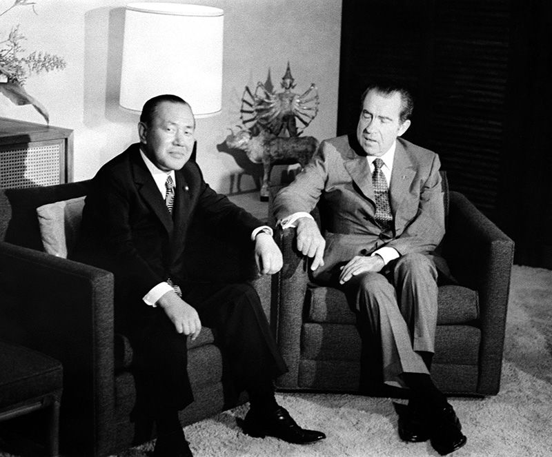 為實現日中邦交正常化而訪華之前,田中角榮(左)在夏威夷與尼克森(右)舉行了會談。攝於1972年8月(時事通信社)