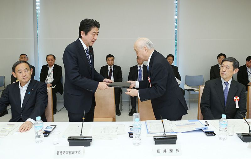 安倍晉三首相(中央左)在其私人顧問機構「關於重建安全保障法律基礎懇談會」(安保法制懇)上接受會議主席、國際海洋法法庭庭長柳井俊二(中央右,前駐美大使)提交的報告書。右端為代理主席、國際大學校長北岡伸一,左端為官房長官菅義偉。攝於5月15日下午,東京首相官邸,時事通信社