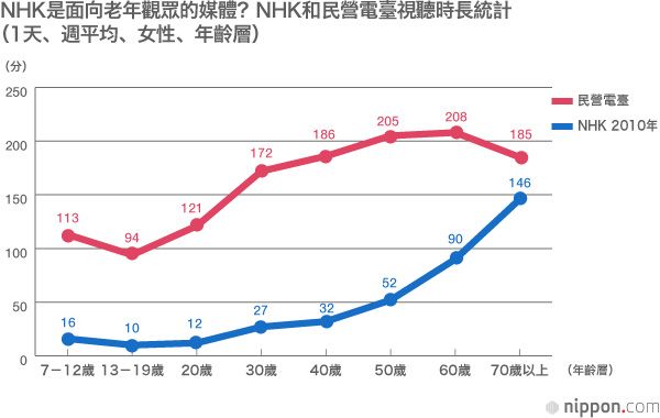 根據NHK 2010年的調查顯示,13歲至19歲的觀眾,一週當中收看NHK節目5分鐘以上者所占比率,無論男女都停留在40%左右。換言之,日本大約有60%的青少年一週當中一次也沒收看NHK的節目。從時長上來看,10多歲的觀眾平均每天收看NHK的節目10分鐘左右,而隨著年齡的增加,那些6、70歲的老年人中,收看人數接近90%,每天平均收看時間超過2小時,由此可以看出,NHK很明顯是一家「面向老年人的媒體(*3)」。如此下去,總有一天恐怕將不再有人收看NHK的節目了——NHK內部充斥著這樣一種危機感。