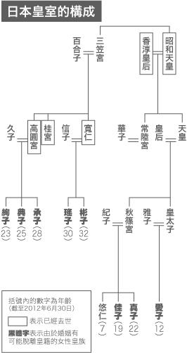 典子女王結婚後,包括明仁天皇在內,皇室將由20人構成。其中具有皇位繼承權者5人,按繼承順序,分別為①皇太子(明仁天皇之長子,54歲)、②秋篠宮(次子,48歲)、③悠仁親王(明仁之孫、秋篠宮之長子,7歲)、④常陸宮(明仁之弟、昭和天皇之次子,78歲)、⑤三笠宮(大正天皇子四子、昭和天皇之幼弟,98歲)。
