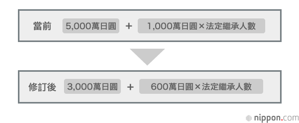 但是,發生在2015年1月1日之後的遺產繼承,其基礎免徵額和過去相比縮小了4成。之前所示的兩個孩子家庭的例子中,免徵額從之前的7,000萬日圓降低到了4,200萬日圓(3,000萬日圓+600萬日圓×2人)。在稅法修訂之前擁有的財產不超過遺產稅免徵額的人群,修訂後就有可能變成遺產稅的徵稅對象。