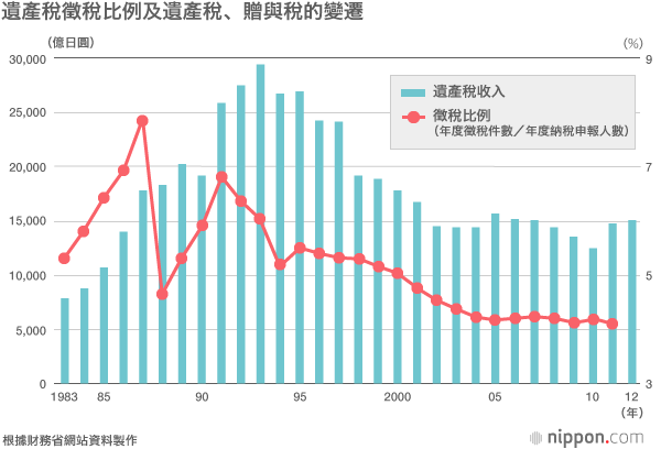 另外,泡沫經濟崩潰之後,不僅徵稅對象減少,遺產稅的收入也明顯下降。下圖是財務省網站公布的圖表「遺產稅徵稅比例及遺產稅、贈與稅的變遷」