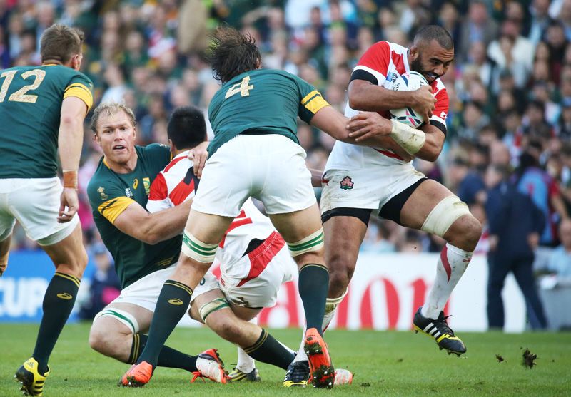 橄欖球世界盃預選賽,南非隊對日本隊。後半場,日本國家隊的利奇隊長(右端,東芝)正在快速奔跑,2015年9月19日,英國布萊頓(Brighton)(圖片提供:時事通信社)