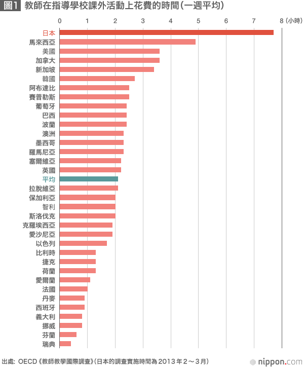 經濟合作暨發展組織(OECD)在全世界34個國家和地區的國中教師中開展的「教師教學國際調查」(日本2013年2~3月實施)結果顯示,日本教師的工作時間是最長的。