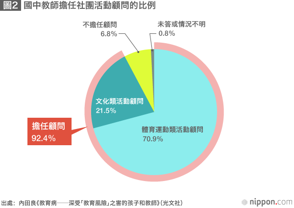 但實際上,特別是在很多國中,全體教師擔任活動顧問已成為一種慣例。下面這個資料雖然有些老了,但通過這個文部科學省2006年開展的全國調查發現,國中教師有92.4%,近乎全部都擔任了社團活動的顧問(參見圖2)。可以說,這已經和自願無關,而是強迫了。