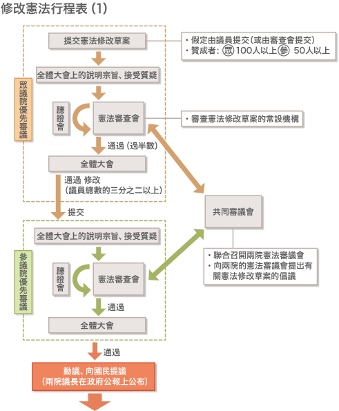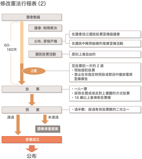 第1次安倍政權時期出臺的國民投票法規定在國會發起修憲動議後的60到180天內實施全民公投。另外,投票要針對買一項欲修改的條文方案逐一表態。考慮到這一系列的日程安排,可以推算出全民公投最早將在2017年末實施。如果國會第1階段的修改項目梳理工作和第2階段的修憲草案製作工作分別出現延遲,那麼全民公投將大大「延後」。