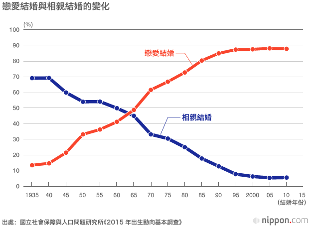當時,絕大多數人還都以相親方式結婚(據《2015年出生動向基本調查》,1957年,相親結婚占54.0%,戀愛結婚占36.2%)。戀愛結婚的比例超過相親結婚是在1965年左右。當年皇太子殿下的婚姻被稱為「網球場之戀」,突出強調了他們是自由戀愛結婚這一點。二人在輕井澤的網球場相識,相互愛慕並選擇對方作為終身伴侶。於是,自由戀愛結婚成為民眾的嚮往。皇族也在愛情的基礎上選擇自由戀愛結婚,這樣的報道給希望戀愛的年輕人以莫大的勇氣。