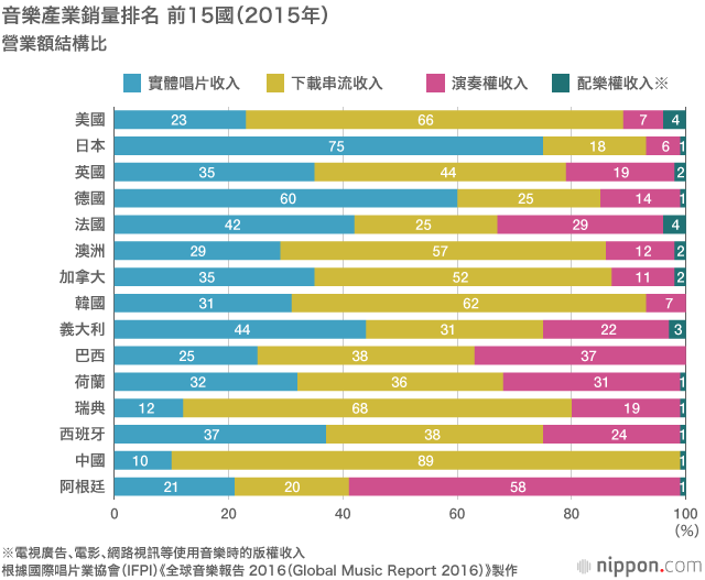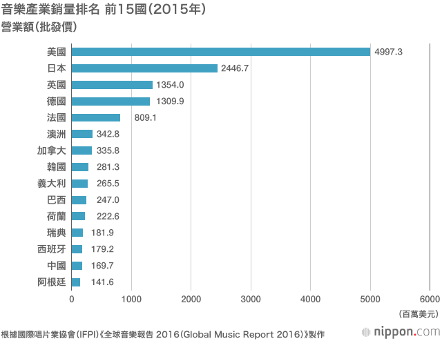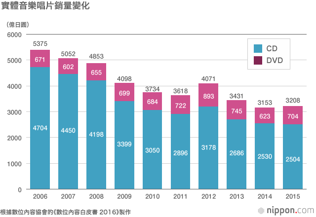 2015年日本實體唱片(CD、DVD等)市場規模為3,208億日圓。雖然開始走下坡路,但依然在2009年超過美國,成為全球最大的實體唱片市場。實體唱片占整個音樂市場銷量的70%以上,這一占比遠超過其他國家。